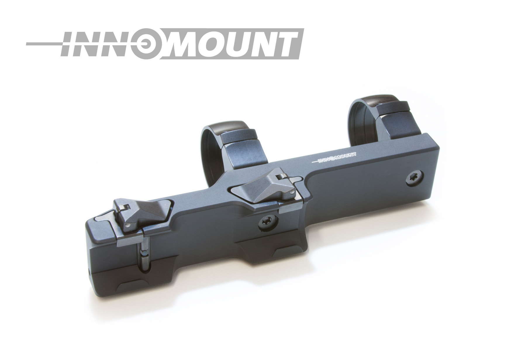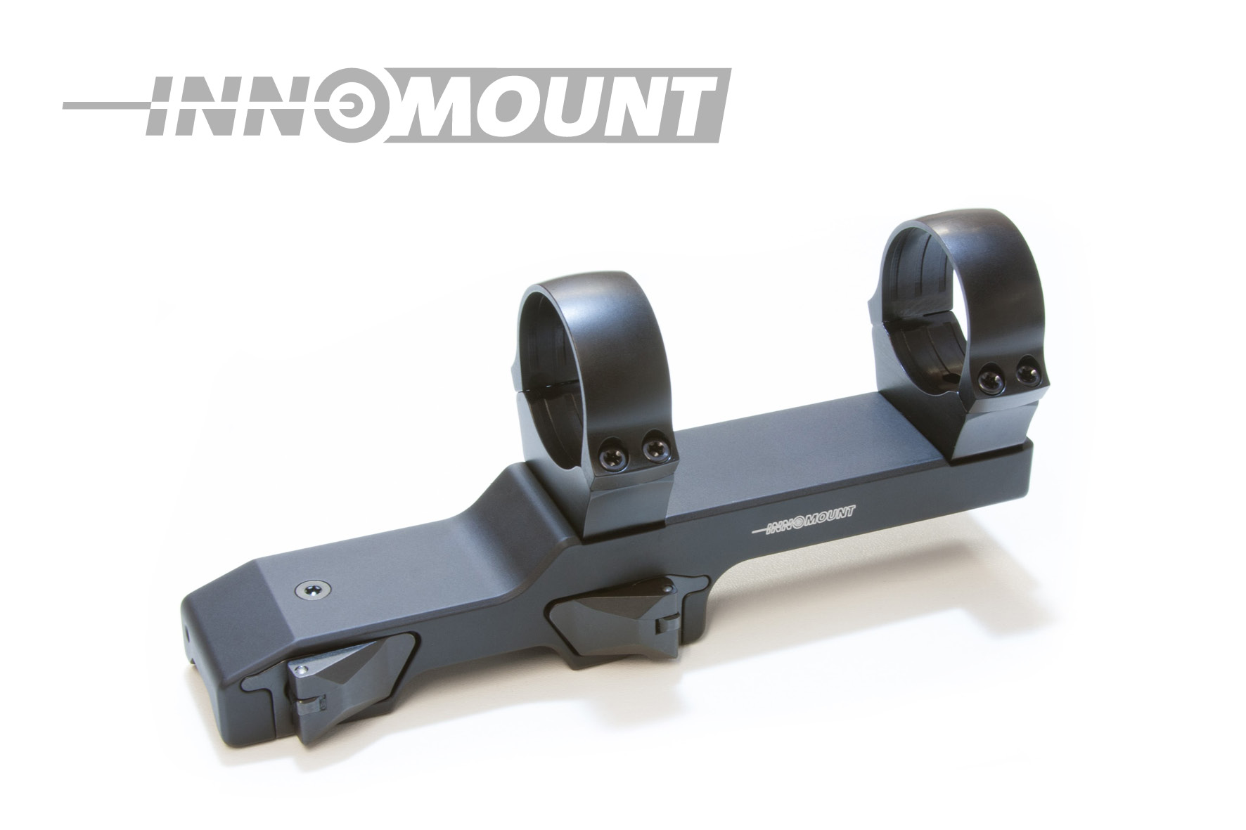 Die INNOMOUNT QD Schnellspannmontage ist mit zwei versenkbaren Verschlusshebeln ausgestattet. Der Vorteil liegt in der einfachen und schnellen, sowie fast werkzeuglosen Bedienung. Nach dem Auf – und Absetzen der Montage wird bei fachgerechter Einstellung der Klemmkräfte eine Wiederholgenauigkeit garantiert. Zwei per Daumendruck zu bedienenden Druckknöpfe ermöglichen es, die zum Schutz vor ungewolltem Lösen versenkten Verschlusshebel zu betätigen und diese zu öffnen.
