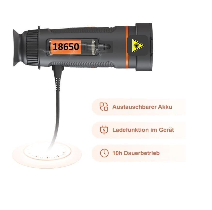 Die WILD-Serie wird die beliebte Cyclops-Serie nicht nur ersetzen, sondern auch in vielen Punkten übertreffen. Das komplette Design wurde überarbeitet und verfeinert und das alles unter Berücksichtigung der Kundenwünsche / bzw. Anregungen. Verbaut ist die neueste Sensor-Technologie mit einer Systemleistung (NETD) von ≤ 18 mK und einem nach neuesten Methoden abgestimmten Bildalgorithmus, wodurch das Bild sehr scharf und kontrastreich abgebildet wird. Die Fokussierung erfolgt nach innovativen Prinzip mit dem oben platzierten Fokussierrad, welcher sich mit einem Finger sehr präzise und feinfühlig einstellen lässt. Zusätzlich besitzt die neue WILD-Serie ein Akkuwechsel-System, welches mit dem beliebten 18650 Akku betrieben wird. Dank des zweiten Akkus, welcher sich im Lieferumfang befindet, wird eine Betriebsdauer von bis zu 20 h generiert.
